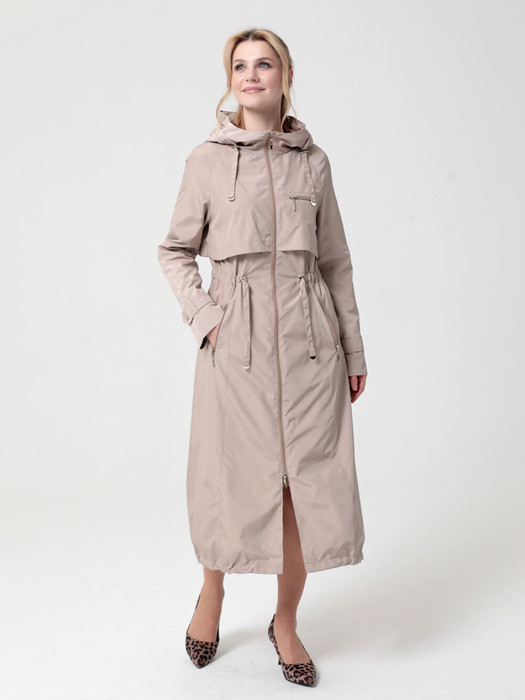 Длинный весенний плащ А-образного силуэта с рукавами покроя реглан и отлетными кокетками по спинке и полочке подойдет для женщин и девушек любого возраста. Застежка на двухзамковую молнию позволяет расстегнуть изделие как сверху, так и снизу, регулируя тем самым ширину шага при ходьбе и подъеме. Воротник - стойка, переходящая в регулируемый капюшон. Внешние карманы застегиваются на молнию. Есть внутренний кармашек, тоже на молнии. Прилегание по талии  обеспечивается с помощью эластичной ленты и кулиски. Ширину по низу изделия можно регулировать затяжкой, тем самым меняя силуэт. Плащевая ткань имеет водоотталкивающую пропитку, которая выдержит небольшой дождь и легкий ветер. Плащ выполнен в модных цветах, выбирайте понравившийся, фантазируйте с обувью и аксессуарами, и Ваша весна будет не только комфортной, но и стильной!