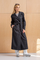 Плащ в длине миди, выполнен из ткани с водоотталкивающей и грязеотталкивающей обработкой. Силуэт слегка расширенный к низу. Отложной воротник с цельнокроеной стойкой. Центральная застёжка на петли и пуговицы. Спереди функциональные карманы-листочки. Рукава кроя реглан, по низу обработаны паты с застежкой на пуговицы. Спинка со средним швом со шлицей по низу. Плащ на подкладке.