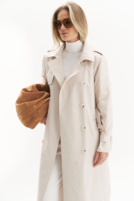 Благодаря регулируемому поясу можно подчеркнуть талию, а лаконичные пуговицы в тон ткани придают завершенность дизайну. Практичные карманы и продуманные детали делают этот плащ идеальным выбором для межсезонья.