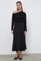 Платье с круглым вырезом, срез горловины обработан окантовкой из основной ткани. Платье отрезное и присборенное по линии талии. Рукав три четверти на приспущенной пройме, что доставят удобства каждой женщине. Низ изделия и низ рукава подогнуты на плоскошовке. Поясок также из основной ткани