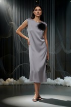 Платье трапецевидного силуэта из трикотажного полотна с втачными рукавами из креп- шифона.Горловину украшают пришитые бусы.
