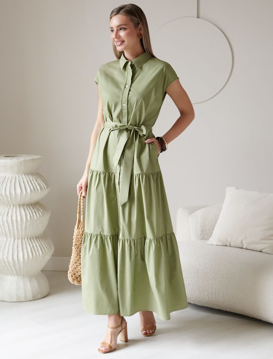 Состав: 77%Хлопок 20%ПЭ 3%ПУ Плотность: 96 Г/м2Платье А-силуэта с поясом оливкового цвета выполнено из легкого хлопкового поплина плотностью 96 Г/м2. Воздушное платье на пуговицах по всей длине с пышной юбкой-воланами в стиле бохо отличный вариант для теплой и жаркой погоды. Модель обладает красивым ярусным кроем, который придает образу женственность и элегантность. Отложной воротничок и короткий рукав создают стильный акцент, подходящий для повседневного ношения и различных ситуаций. Талия подчеркнута поясом, который легко регулируется и подчеркивает силуэт, придавая особый шарм и аккуратность образу. Натуральный состав ткани обладает высокой воздухопроницаемостью, а также способностью поглощать и отдавать влагу. В повседневном платье будет очень комфортно, благодаря правильной регуляции температуры тела. Такая модель подходит на маленький и высокий рост, а так же на любую фигуру, позволяя подчеркнуть достоинства и скрыть возможные недостатки. Это длинное платье отлично подойдет тем, кто ценит удобство и утонченность в одежде из качественной вискозы и хлопка. Красивое легкое платье прекрасно подходит для динамичного рабочего дня, городских прогулок или торжественных мероприятий, его легко адаптировать под разные ситуации и стили.