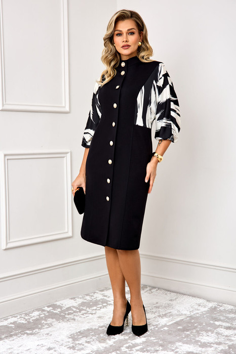 Стильное женское платье, выполнено из высококачественного трикотажа, рукава платья выполнены из атласной ткани с модным дизайнерским принтом, в стиле летучая мышь, по низу рукав на резинке. Платье с застежкой по переду на пуговицы, с горловиной стойкой, что придает модели особый стиль и шарм. Модель удобная и практичная, отлично подойдет для ежедневной носки и торжественного мероприятия.