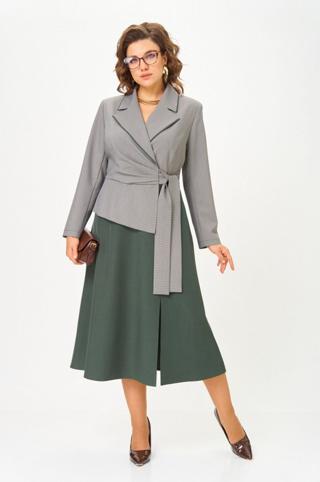 Платье  построено на контрасте текстур и цветов: холодная серая «гусиная лапка» + глубокий тёмно-зелёный оттенок хвои. Асимметрия с запахом верхней части платья и разрез на юбке вытягивают силуэт, делают образ динамичным и современным. Зелёная окантовка лацканов и пояс выступают связующим элементом между верхом и низом, создавая цельный и очень дорогой вид. Образ выглядит дорого, интеллигентно и слегка провокационно.