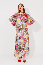 Платье силуэта трапеция. Перед с нагрудными выточками и с V- образным разрезом верху %%по горловине. Рукава втачные, одношовные, короткие. Горловина круглой формы обработана окантовочным швом.