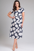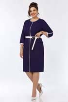 Платье женское прилегающего силуэта, расклешенное к низу. По переду платья нагрудные складки, воротник пиджачного типа, застежка с имитацией запаха,с пришивным декоративным элементом. С переди по талии отдельная фигурная баска с клапаном. Спинка со средним швом и талиевыми вытачками. Рукав одношовный 7/8.Юбка притачная на подкладке. В боковом шве платья застежка на потайную тесьму-молнию