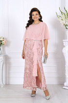 Стильное женское платье расклешёного силуэта с округлоым вырезом горловины на стойке . К стойке воротника пришита декоративная рюша. По спинке платья на стойке две декоративные пуговицы и маленький разрез ввиде капли. Платье шифоновое на трикотажной подкладке. В качестве декоративной отделки служит съёмный пояс. Низ рукава на резинке..