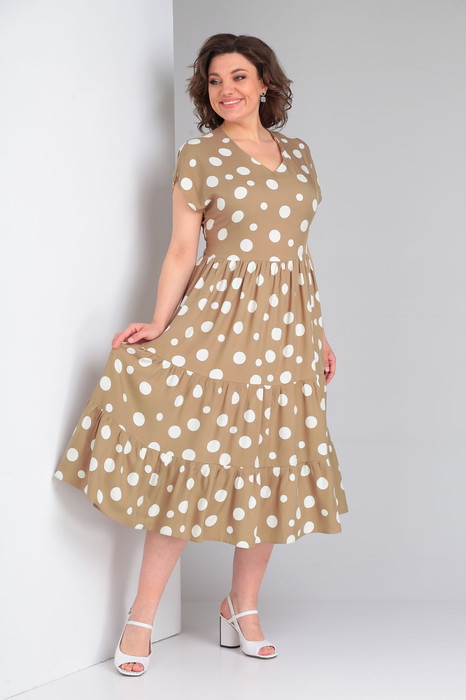 Штапельное бежевое платье в горох. Что может быть приятнее и красивее! По переду горловина с А- образным вырезом ,отрезное по линии талии и тремя воздушными валанами. По спинке по линии талии резинка- венгерка в несколько рядов. Такая отделка по спинке даёт возможность идельно смотреться на любой фигуре.