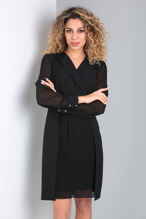 Чёрное маленькое женское платье прямого силуэта. Рукав шифоновый , на манжете две пуговицы. По переду платья запах ,отрезная талия и по переду юбки плиссе. По спинке потайная тесьма -молния.