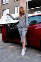 Трикотажное платье средней длины, с красивами рукавами на сборке по низу. Горловина-лодочка с тонкой элегантной бейкой.  Платье имеет универсальный серый немного меланжевый оттенок, по этому подойдет для любого случая в жизни.
