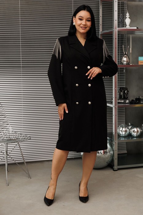 Платье женское из текстильной ткани двубортное, полуприлегающего силуэта. По полочке и спинке прилегание создается за счет рельефов, выходящих из проймы. По спинке - средний шов, переходящий в шлицу. Вороник пиджачного типа. Застежка на петли и пуговицы. Рукав втачной двухшовный со шлицей и пуговицами. По окату рукова отделка в виде металлезированной бахромы. Длина по спинке: (50-54)-104 см, (56-58)-107см. Длина рукава: (50-54)-60см, (56-58) 62 см.