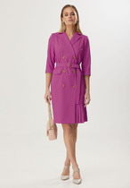 Элегантное женское платье  необычного кроя станет изюминкой вашего гардероба. Платье  прилегающего силуэта, отрезное по линии талии, по передеу застежка на петли и пуговицы, в верхней части платья по полочке прилегание создается за счет талиевых выточек, по спинке - за счет резинки по линии талии.  Юбка-полусолнце с односторонними  складками, по бокам карманы. Плечо спущенное, рукав укороченный, на высокой  манжете на одну пуговицу. Горловина по полочке выполненна в виде цельнокроеной стойки, переходящей в отрезную по спинке. В качестве декора по краю борта идет жабо, переходящее в цветок.  В комплекте съемный пояс в тон платья. ВНИМАНИЕ! брошь в комплект не входит. Длина по спинке:-111см. Длина рукава с манжетой-51см.