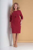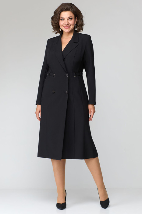 Платье полуприлегающего силуэта, выполнено из однотонной ткани. Платье длиной за колено, с небольшим расклешением по низу. Полочка платья с двубортной застежкой на пуговицы.  Полочка с вертикальными рельефами. В шве притачивания бочка к средней части полочки обработан карман. Горловина V-образной формы, с отложными лацканами и воротником пиджачного типа. В области талии выполнен декоративный элемент из хлястиков и металлических рамок.