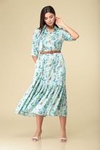 Прямой силуэт. Втачные укороченные рукава, понизу присобраны на резинке. Вырез горловины округлый с декоративным элементом-цепочкой. Низ платья украшает притачной волан.