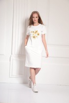 Платье прямого силуэта, зауженное по талии, длиной до середины голени, с потайной застёжкой молнией по спинке. Длинный рукав. По переду разрез, который придаст вашему образу игривости. Платье со съёмным поясом, при помощи которого можно создавать различные образы давая волю фантазии. Платье будет актуально, как и для повседневной носки, так и для торжеств.