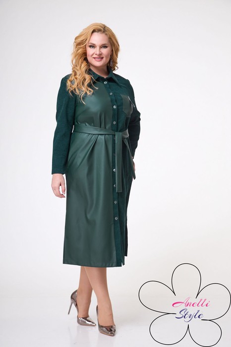 Платье-рубашка, прямого кроя, чуть расширенный к низу силуэт, длина миди. Длинный рукав. Классический рубашечный воротник на стойке. Застежка на петли пуговицы по переду. По переду нагрудный карман и карманы в боковых швах. Платье декорированно тесьмой по переду на нагрудном кармане и по спинке по кокетке. Подчеркнуть талию можно при помощи съемного пояса. Сочетание кожи и вельвета придаст образу новизны, свежести и стиля. Платье будет радовать вас не один сезон и вы в нем будете выглядеть законодательницей мод.
