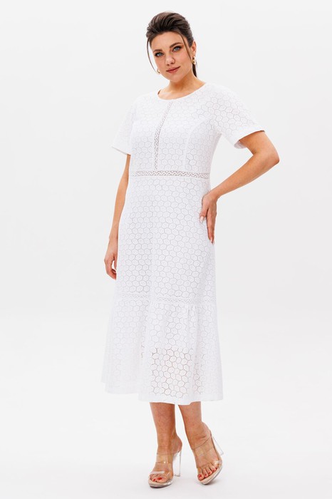 В этом платье словно воплотилась сама нежность — струящийся полуприлегающий силуэт мягко обволакивает фигуру, подчеркивая изящество линий. Круглый вырез горловины, скромный и элегантный, обрамляет лицо, даря ощущение легкости и чистоты. Короткий рукав-реглан, словно вторящий естественным изгибам плеч, добавляет образу воздушности.