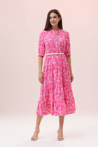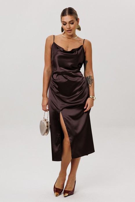 Платье актуальной во все времена длины миди с игривым разрезом изящно струится во время движения, приковывая взгляды. В правом боковом шве спрятана потайная молния. Вырез платья-качели нежно ниспадает, подчеркивая декольте и делая образ соблазнительным.