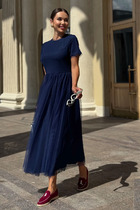 Особый шарм модели придают детали: втачной рукав, мягко собранный на резинку у манжеты, создает легкий объем. Неожиданная и изящная драпировка на левом боку, образованная кулиской, добавляет динамики и движения силуэту.