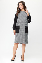 Полуприлегающий силуэт, вертикальные рельефы от проймы по переду и спинке платья, двубортное с отложными лацканами и воротником, ассиметричная застёжка на молнии, втачные рукава 3/4 длины со складкой по низу.