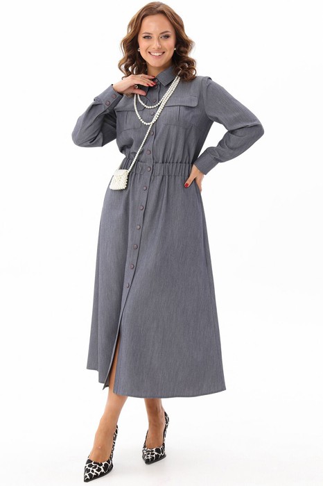 Платье полуприлегающего силуэта, расклешенное книзу. Воротник отложной, на притачной стойке. Платье отрезное по линии талии, на широкой резинке. Платье с центральной застежкой на кнопки на притачных планках. Полочка с нагрудными вытачками и накладными карманами со складкой и клапаном. В боковых швах юбки функциональные карманы. Рукав втачной длинный, понизу - широкая притачная манжета с застежкой на кнопки.