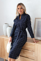 Платье полуприлегающего силуэта, расклешенное книзу. Воротник отложной, на притачной стойке. Платье отрезное по линии талии, на широкой резинке. Платье с центральной застежкой на кнопки на притачных планках. Полочка с нагрудными вытачками. В боковых швах юбки функциональные карманы. Рукав втачной короткий, с открытым плечом, понизу — притачная манжета и декоративная пата на пуговице.