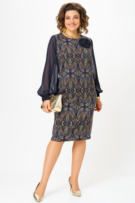 Платье полуприлегающего силуэта с округлой горловиной. Перед с нагрудными вытачками. Спинка с талиевыми вытачками, застежкой молнией и разрезом в среднем шве. Рукав втачной прямой длинный, на резинке по низу.