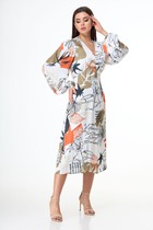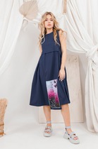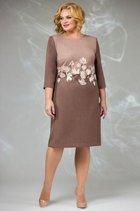 Платье женское, приталенного силуэта. Перед с нагрудными вытачками. Спинка изделия с талиевыми вытачками, со средним швом на застежку молнию. Рукав втачной 3/4. Горловина окружной формы. По переду изделия дизайнерская вышивка. Длина изделия- 99 см. Длина рукава - 46 см.