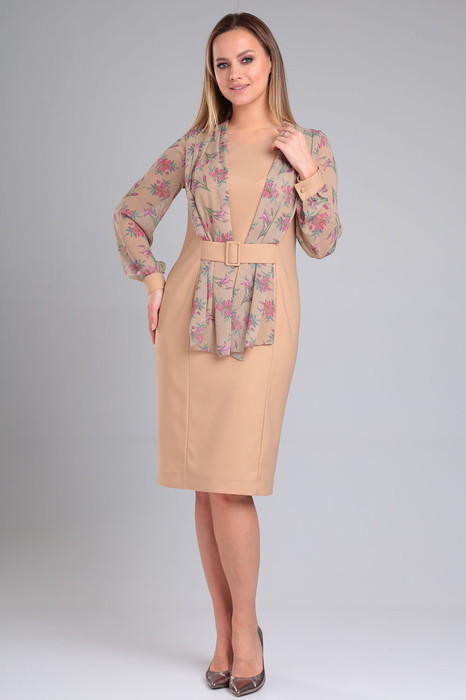 Платье женское полуприлегающего силуэта. Горловина полукруглой формы, обработана обтачкой. Перед с рельефными швами. В плечевых швах переда расположен декоративный шарфик. По линии талии в центральной части переда расположен декоративный пояс с пряжкой. Спинка с рельефными швами и средним швом, в котором расположена застежка на потайную молнию и шлица. Рукав втачной длинный, на манжете с застежкой на петлю и пуговицу.