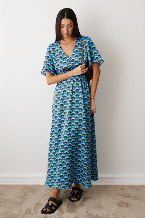 Платье полуприлегающего силуэта выполнено из ткани с контрастным абстрактным принтом. Характеристики: полуприлегающий силуэт, отрез на резинке, V образный вырез горловины, по переду функциональные пуговички, пуговички декорированы тканью основного изделия, рукав втчаной свободного кроя, юбка свободного кроя, в боковых швах юбки разрезы - 57 см. Длина по спинке 134 см, длина рукава 25 см.