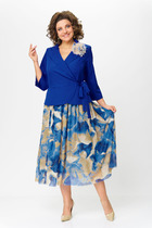 Платье полуприлегающего силуэта выполнено из полотна цвета медь с принтом полевые цветы. Характеристики: полуприлегающий силуэт, отрезное выше талии, фигурный вырез горловины, по переду в области груди декоративная не съёмная деталь, низ и верх рукава на резинка, застежка потайная тесьма молния в среднем шве заднего полотна изделия, юбка в изделии свободного кроя с разрезом (разрез 34 см). Длина по спинке от верхнего края рукава 133 см, длина рукава 63 см.