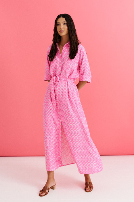 Платье прямого кроя выполнено из ткани розовго цвета с цветочным принтом. Характеристики: прямой крой, отложной воротник, застежка центральная на петли пуговичики , пуговички декорированы тканью основного изделия, по линии талии нашиты шлевки, в комплекте пояс из ткани основного изделия, рукав втчаной по низу рукава подгиб. Длина по спинке 132 см, длина рукава 35 см.