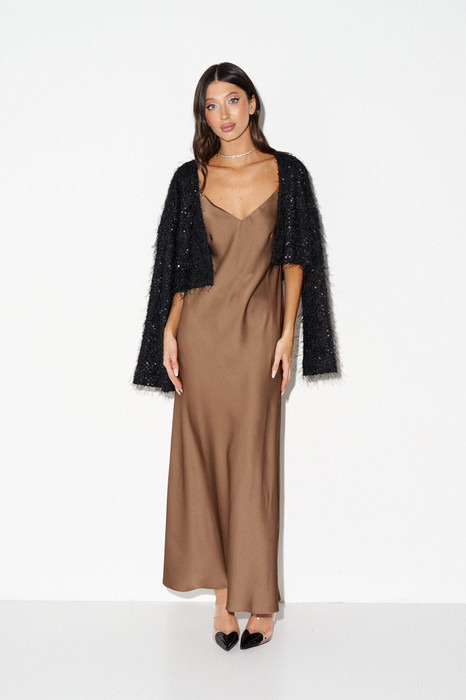 Платье на бретелях, полуприлегающего силуэта. Выполнено из сатиновой ткани бежевого цвета. Характеристики: полуприлегающий силуэт, регулируемые бретели, лиф фигурный с вытачками по переду, . Длина по спинке 114см.
