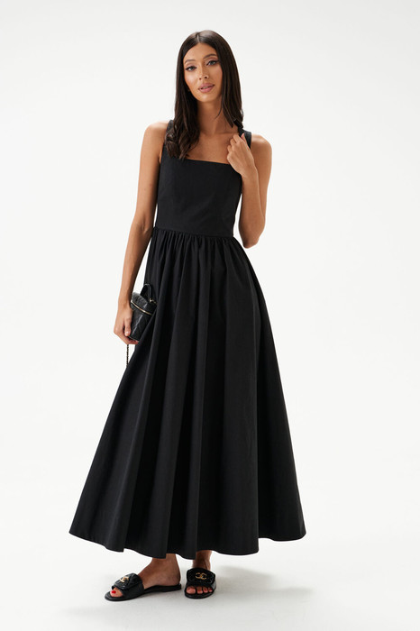 Платье из хлопкового полотна черного цвета. Характеристики: Широкие бретели, юбка свободного кроя со сборкой, в боковых швах карманы, подкладка. Спинка закрытая, застежка - скрытая молния посередине спинки. Длина изделия 115см.