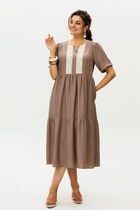 Платье прямого свободного кроя выполнено из текстильного полотна в мелкий горошек. Характеристики: прямой свободный крой, отложной воротник, застежка центральная на петли пуговицы, по линии талии нашиты шлевки, в комплекте пояс из ткани основного изделия, по переду расположены карманы, рукав свободного кроя, по низу рукава подгиб. В боковых швах разрез 52 см.Длина изделия по спинке 133 см, длина рукава 33 см.