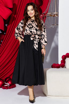 Комплект состоит из двух платьев: платье на бретелях и платье полуприлегающего силуэта. Выполнен из полупрозрачной трикотажной ткани черного цвета. Характеристики:нижнее платье полуприлегающего силуэта, А-образный силуэт, бретели - не регулируемые. Длина по спинке 61 см. Верхнее платье полуприлегающего силуэта, силуэт трапеция, горловина овальная, рукав втачной. Длина по спинке 81 см, длина рукава 66 см.