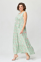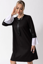 Платье женское свободного силуэта из плательной ткани. Рукав три четверти, силуэт свободный. Горловина V-образная. Перед с кокеткой, из-под которых две складки. Рукав присборен по окату, расширен на резинку по низу. Спинка свободная. По низу платья клешёный волан.