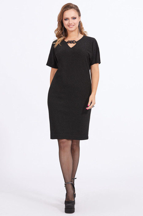 Платье из трикотажа с легким мерцанием, полуприлегающего силуэта с рукавом кимоно. Спинка со средним швом. Оригинальный вырез платья декорирован эффектной пластиковой цепью "софт-тач". Изделие на подкладке.