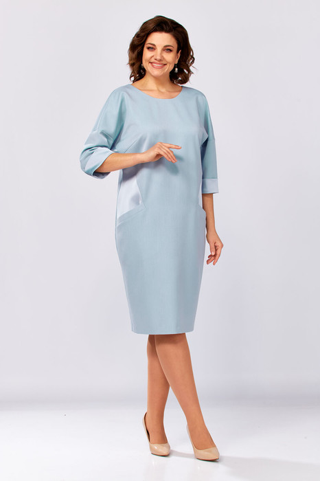 Платье женское, комбинированное из двух видов ткани- однотонной плательной и атласа. Вырез горловины-полукруглый спереди, а по спинке V- образный с планкой до низа изделия и с пуговицами. По бокам переда вставки из атласа и карманы, рукав изделия 3/4 длины с манжетной из атласа. Изделие полуприлегающее без застёжки.