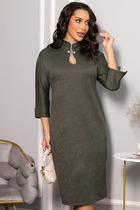 Платье женское из ткани с отделкой из кожзаменителя на хлопчато-бумажной основе, полуприлегающего силуэта с втачным рукавом, с застежкой спереди на планку с пуговицами, с отложным воротником на стойке, с накладными карманами по переду выше линии груди и на линии бедер, под пояс съемный из кожзаменителя. Изделие на подкладке.
