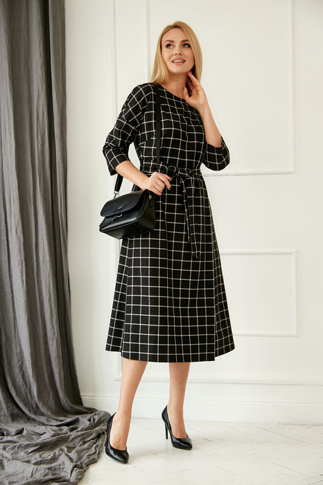 Платье женское из плательной ткани, полуприлегающего силуэта, под пояс из той же ткани, вырез горловины полукруглый, рукав 3/4 длины на спущенной пройме, карманы в боковых швах, по переднему полотнищу юбки-складки, застежка по среднему шву спинки на молнию, изделие без подкладки.