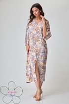 Платье женское свободного силуэта расширенное к низу выполнено из шифона. Перед и спинка с отрезной кокеткой, нижняя часть выполнена из двух деталей внахлёст со складками по верхнему срезу. На спинке "капелька " и застёжка на навесную петлю и пуговицу. Рукава втачные одношовные длиной 3/4 со сборкой на резинку по низу. Круглый вырез горловины окантован. Платье на атласной подкладке от кокетки.