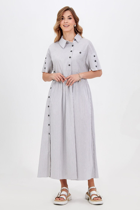 Стильное платье с интересным решением размещения планок и игрой полоски идеально впишется в городские образы в стиле кэжуал. Легкий смесовый материал на основе хлопка приятен для кожи и красиво струится во время носки. Модель свободного кроя с оборкой, с застёжкой на петли-пуговицы, ассиметричным отложным воротником с отрезной стойкой, со спущенной линией плеч с притачными рукавами с застёжкой на пуговицы, с отделочным накладным карманом и функциональными карманами в боковых швах. Длина позволяет носить платье с обувью как на каблуке, так и на плоском ходу.