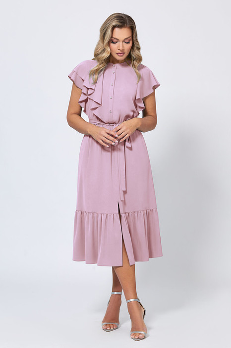 Это женственное платье X-образного силуэта длины миди с интересными деталями - стильное заявление для особых моментов. Нежный цвет и приятная к телу немнущаяся ткань придают модели элегантный вид. Красивая отделка оборками и жабо добавляет выразительности, а разрез по переду красиво смотрится во время движения. Ювелирные пуговицы по планке спереди несут не только функциональный характер, но и добавляют изысканности образу. Скрытая резинка на талии обеспечивает удобную посадку. Тонкий поясок можно завязать бантом, который станет ещё одним украшением платья.