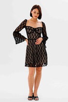 Платье женское А- образного силуэта, один из рукавов с декоративной драпировкой и бантом контрастного цвета, по спинке застежка молния.