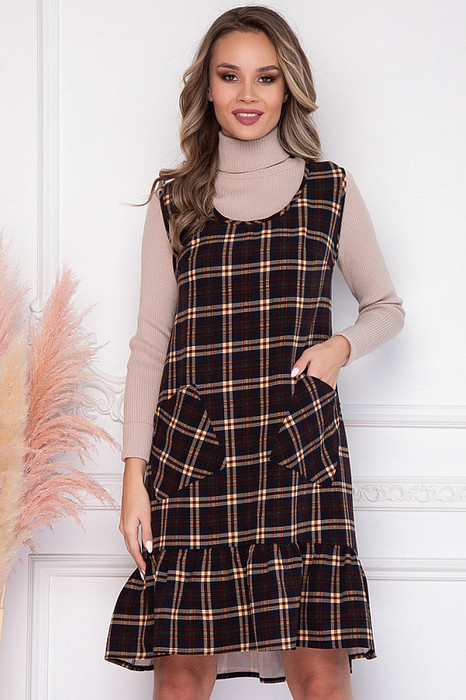Тенереза – платье-сарафан в клетку. Вырез горловины классический овальный, с отделкой по краю. Спереди – накладные карманы, расположенные под небольшим углом. Свободный крой и легкая, дышащая ткань будут просто идеальным под уютный прилегающий свитер на осень.