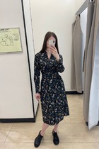 Платье прилегающего силуэта. Горловина круглая, по центру переда шов, по низу шва разрез, с левой стороны по линии талии декоративный элемент. Рукава втачные, фантазийной формы.