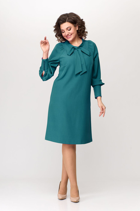 Элегантное женское платье из однотонной плательной ткани. Платье «А» образного силуэта с круглой горловиной оформленной стойкой, украшением служит съемный бант. Платье с фигурной проймой, рукав расширенный, со стойкой по окату и низу. Низ рукава оформлен широким манжетом с декоративными пуговицами. Платье без подкладки.