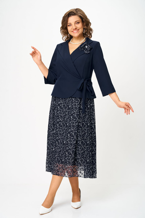 Элегантное женское платье, выполнено в виде имитации костюма из двух видов ткани. Лиф из плательной ткани, юбка из шифона. Платье с запахом, горловина с воротником пиджачного типа с отложными лацканами. Рукава втачные, длина 3/4. Юбка со складками по линии талии, расширенная к низу, на подкладке. По линии талии вставлен завязывающийся пояс.