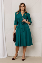 Платье полуприлегающего силуэта отрезное по линии талии, нижняя часть расширена, с воланом по низу. Платье с втачным рукавом со сборкой по окату и внизу на резинке. Лиф с V-образным вырезом и имитацией центральной застежкой на пуговицы. По спинке и переду вставка на талии с резинками. По горловине стойка с рюшей, которая завязывается по переду. Платье на подкладке.